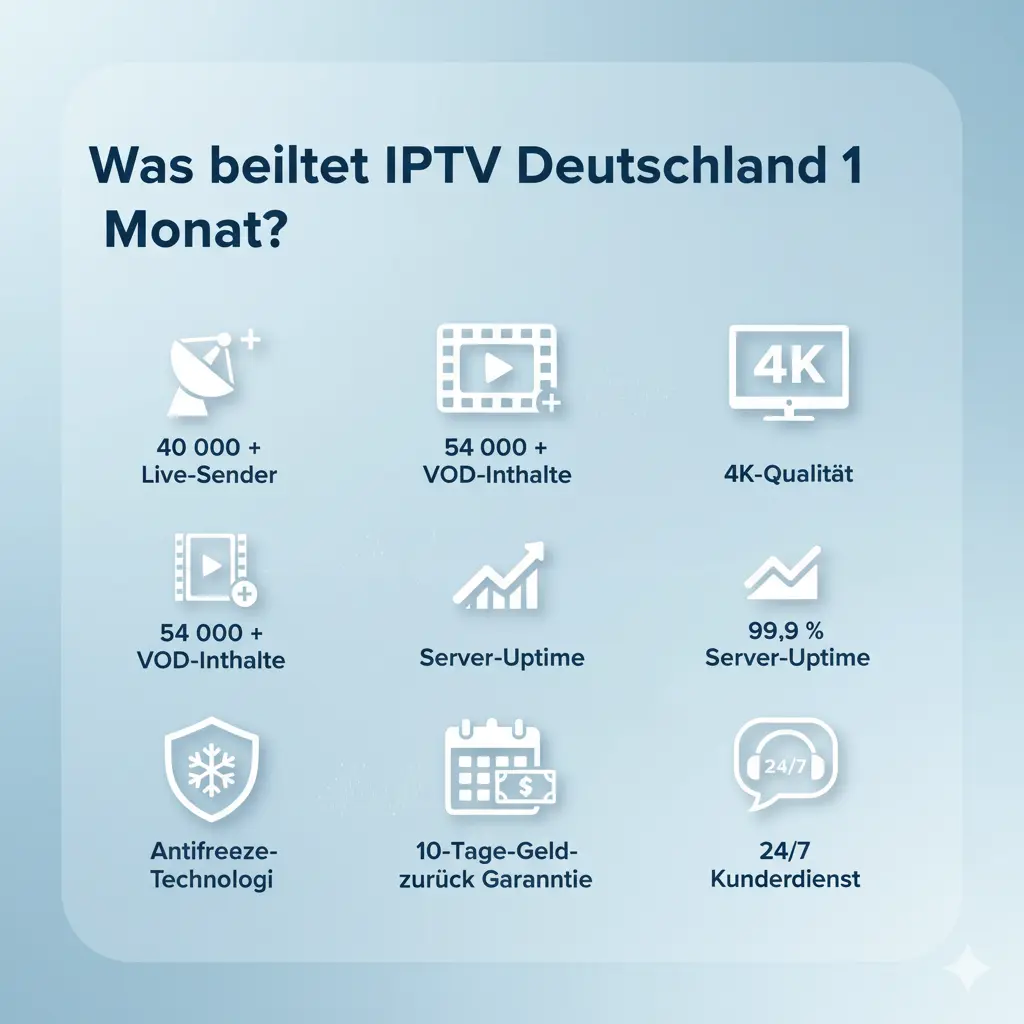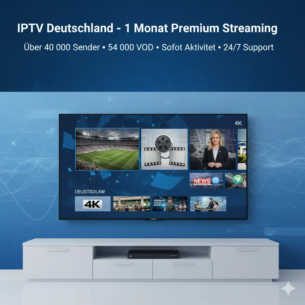 IPTV Deutschland 1 Monat: 40.000+ Kanäle, 54.000 VOD, 4K Streaming & 24/7 Support. Sofort aktiv. 10 Tage Garantie. Jetzt bestellen!